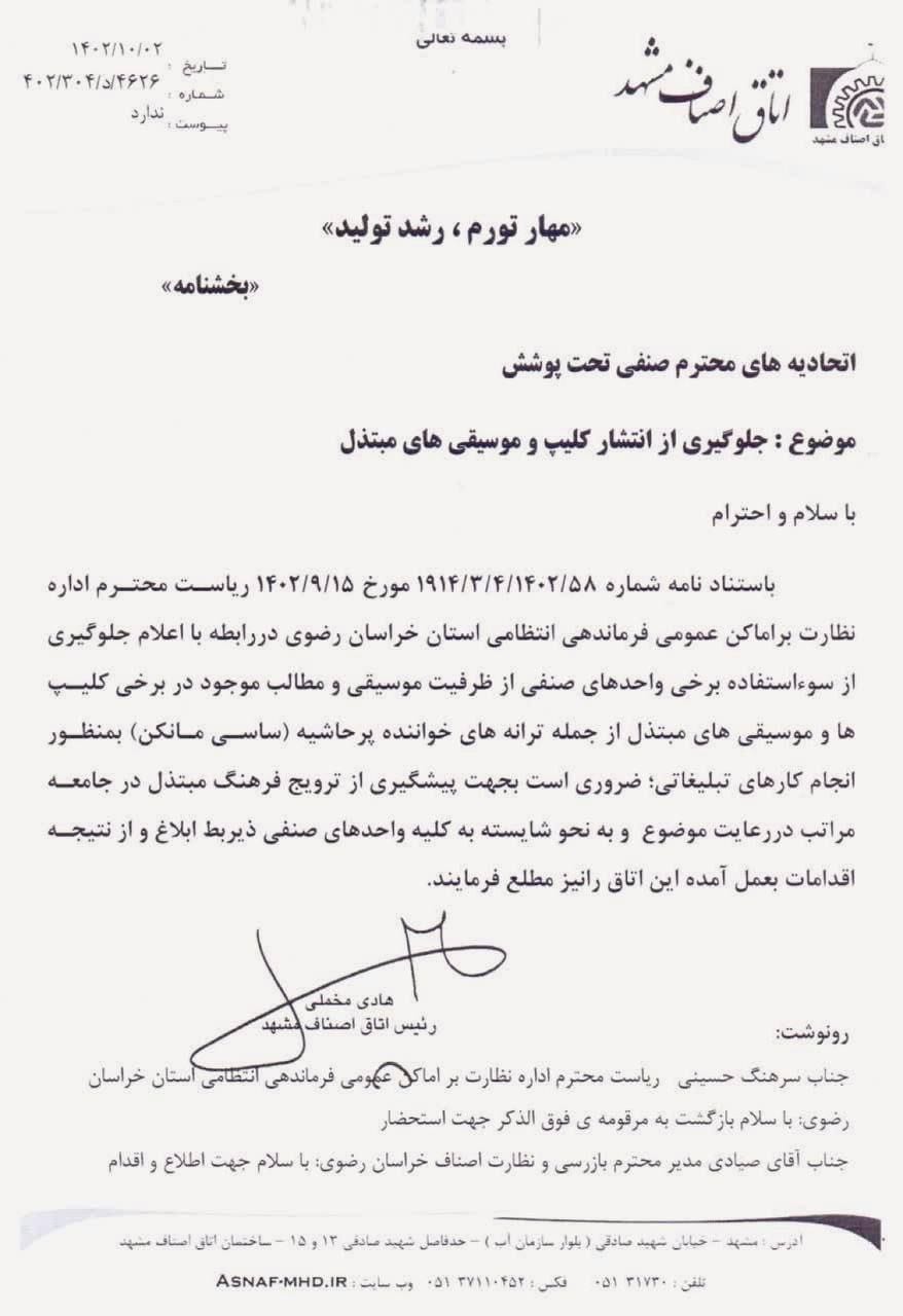 اتاق اصناف شهر مشهد نسبت به حاشیه های موزیک ساسی مانکن واکنش داد که در ادامه سندی که در این باره منتشر شده است را مشاهده میکنید.