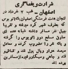 به گزارش پارسینه پلاس و به نقل از اطلاعات آنلاین، شب ۷ خرداد ۱۳۲۳ راهزنان که در حوالی شهر لنجان کمین کرده بودند به اتوبوسی که از اصفهان به سمت شهرکرد در حال حرکت بوده حمله کرده و اموال مسافران را به غارت بردند. روزنامه اطلاعات ۲۳ خرداد ۱۳۲۳ این خبر را منتشر کرد. خبر را بخوانید و عکسهایی از اصفهان ۸۰ سال پیش تماشا کنید.