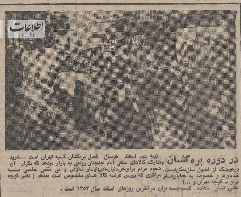 به گزارش پارسینه پلاس، اغلب بازارها که در روزهای آخر اسفند ماه شلوغ و پر رفت و آمد هستند در روزهای تعطیلات نوروز ساکت و خلوت می شوند. عکاس روزنامه اطلاعات از این دو وضعیت در بازار مهران- برلن تهران عکاسی کرد. عکسها را از روزنامه اطلاعات ۴ فروردین ۱۳۵۳ تماشا کنید.