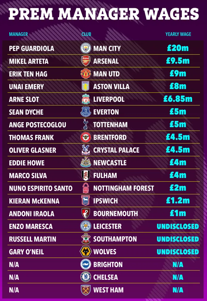 بعد از رفتن پوچتینو، میکل آرتتا از آرسنال به دومین مربی پردرآمد لیگ برتر تبدیل شده است. او سالانه ۹.۵ میلیون پوند درآمد دارد.