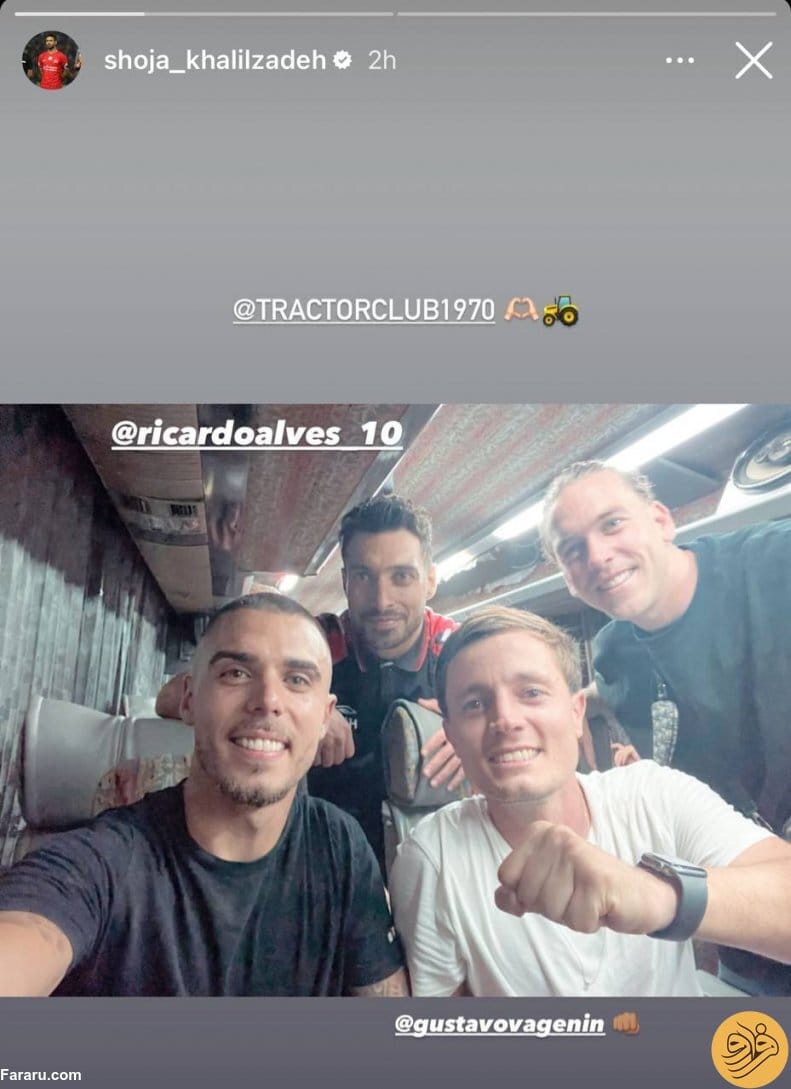 تصویری که شجاع از خود و سه بازیکن خارجی تراکتور منتشر کرده، پایانی است بر همه حرف و حدیثهای رختکن تراکتور. در این تصویر که از اتوبوس تراکتور به بیرون آمده، ریکاردو آلوز در حالی که موبایل بر دست دارد. لبخند میزند و در کنار خود گوستاوو، گلزن سه امتیازی بازی، را دارد که او هم با لبخند و مشت گره کرده، خوشحالی خود را نشان میدهد.