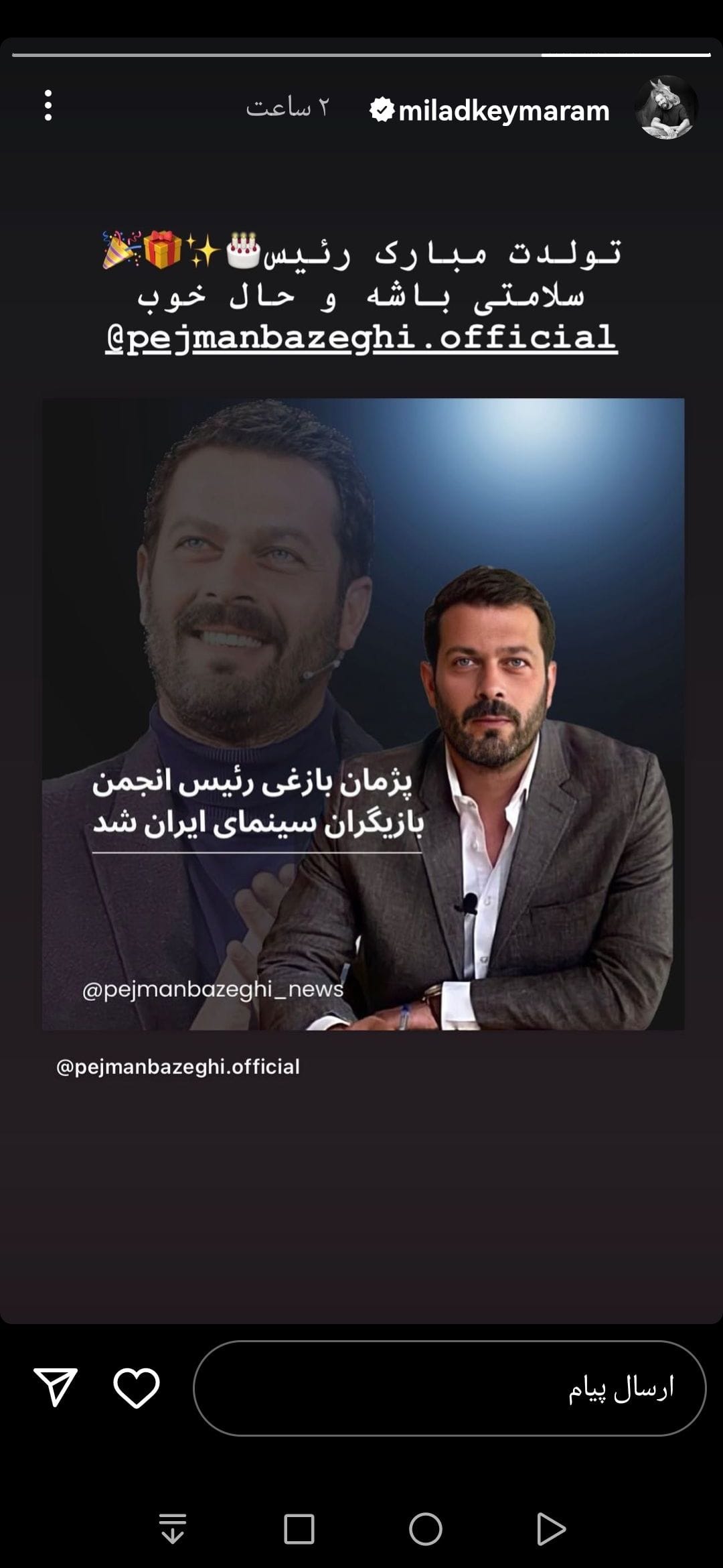 میلاد کی مرام به مناسبت تولد پژمان بازغی یک استوری اینستاگرامی منتشر کرد.
