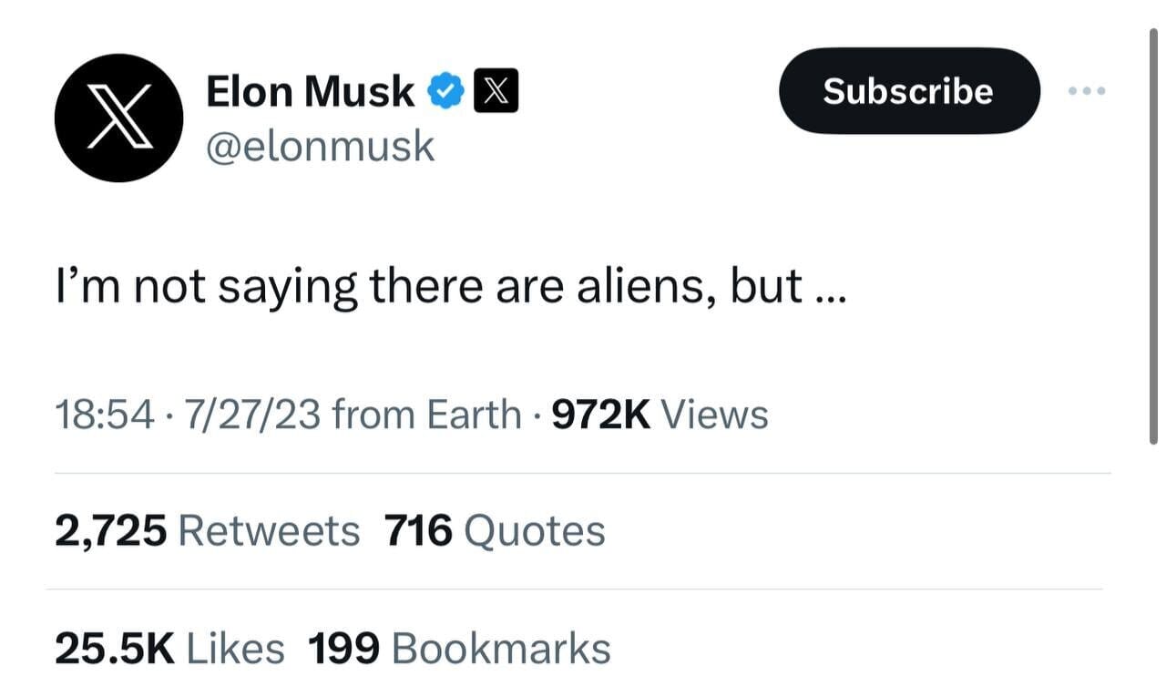 در این توییت ایلان ماسک نوشته است: من نمی گویم موجودات فضایی وجود دارند اما…
