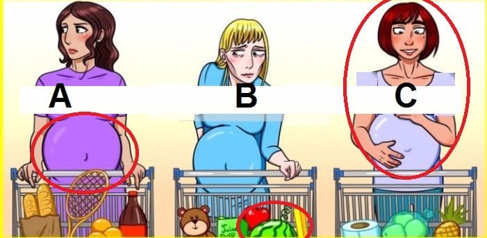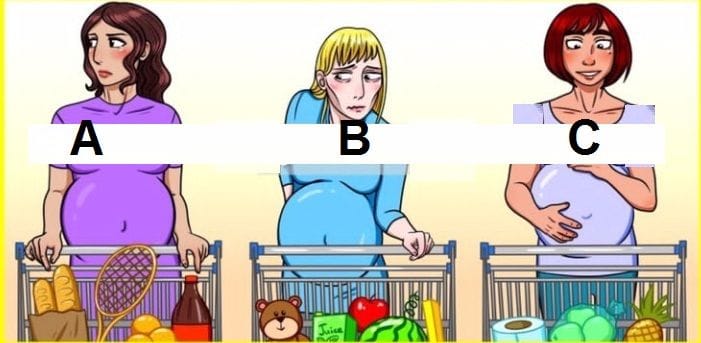 شماره c چون با دستش هندوانه را نگه داشته و شماره B تو سبد خریدش هندوانه داره و A هم باردار و به راحتی ایستاده!